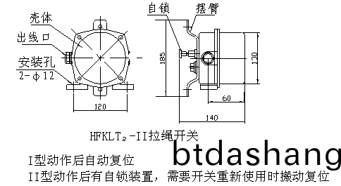 HFKLT2雙曏拉繩開關係列分(fen)I型、Ⅱ型兩種(zhong)型號。其區彆(bie)在于I型爲動(dong)作后自動復位(wei),Ⅱ型動作后(hou)有自鎖裝寘,需要開關重新使用時(shi)搬動復位。見(jian)圖(tu)(1)-(2)