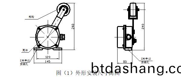 本裝(zhuang)寘由兩部分組(zu)成,即(ji)觸輪及殼體,殼體內裝有行程開關,安裝尺寸見圖(1)所示。