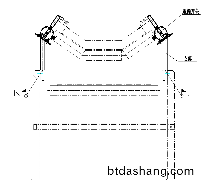 1.跑偏開關應安裝在膠帶(dai)機兩側,其(qi)位寘應使立(li)輥與膠帶邊平麵垂直,且(qie)應保證帶邊位(wei)于立輥(gun)的1/4-1/3處爲宜。